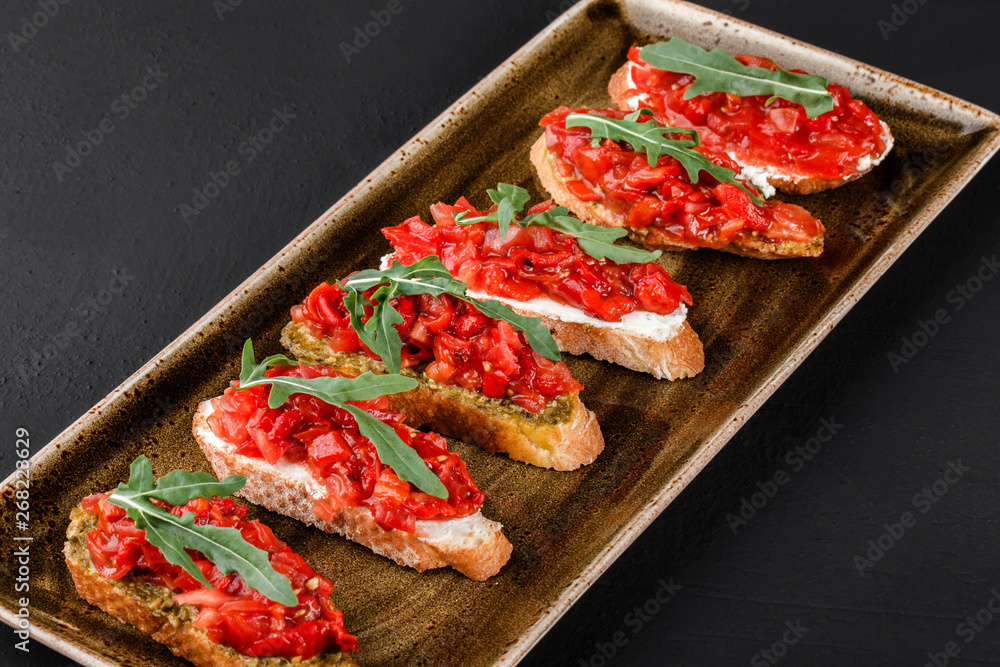 Appetizer bruschetta with chopped vegetables on ciabatta bread and sauce pesto on plate over black stone background. Vegetarian food concept. Delicious snacks, sandwiches, crostini, canape, antipasti.