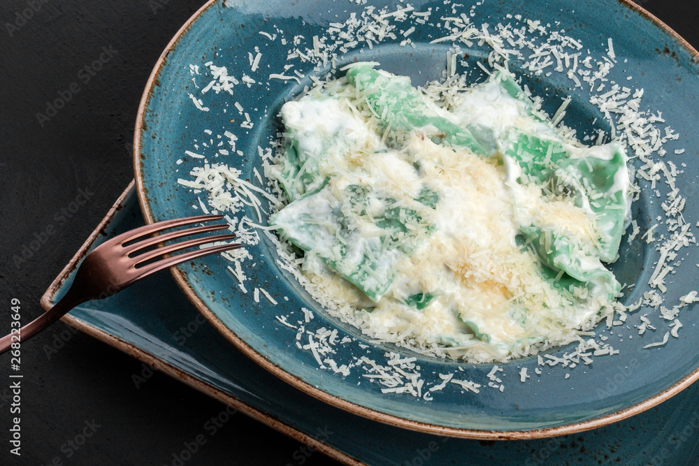 Ravioli with spinach and basil, parmesan cheese on plate over black stone background. Clean eating, vegetarian food concept.