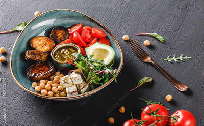 Healthy Buddha bowl dish with avocado, tomato, cheese, chickpea, fresh arugula salad, baked potatoes and sauce pesto in black background. Dieting food, clean eating.