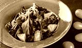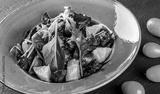 Salad with liver, arugula, orange, spinach and almonds on plate over dark stone surface. Healthy food concept. Top view.