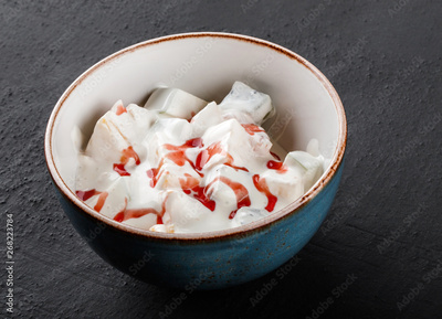 Fruit salad with banana, orange, grapes and pomegranate with cream sauce in bowl over dark background. Healthy breakfast.