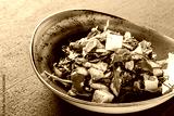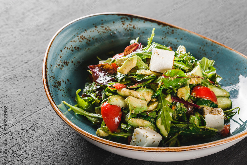 Healthy fresh salad with avocado, greens, arugula, spinach, cherry tomatoes and cheese in plate over dark table. Healthy vegan food, clean eating, dieting, top view