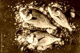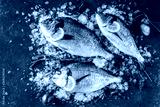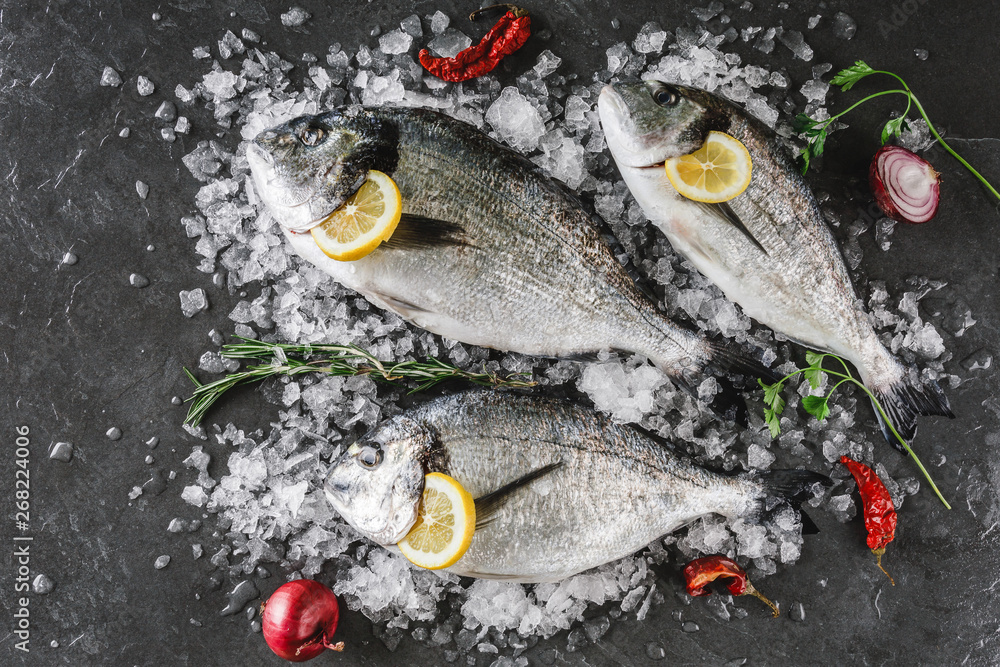 Fresh raw dorado fishes with spices, lemon, pepper, rosemary on ice over dark stone background. Creative layout made of fish, top view, flat lay.