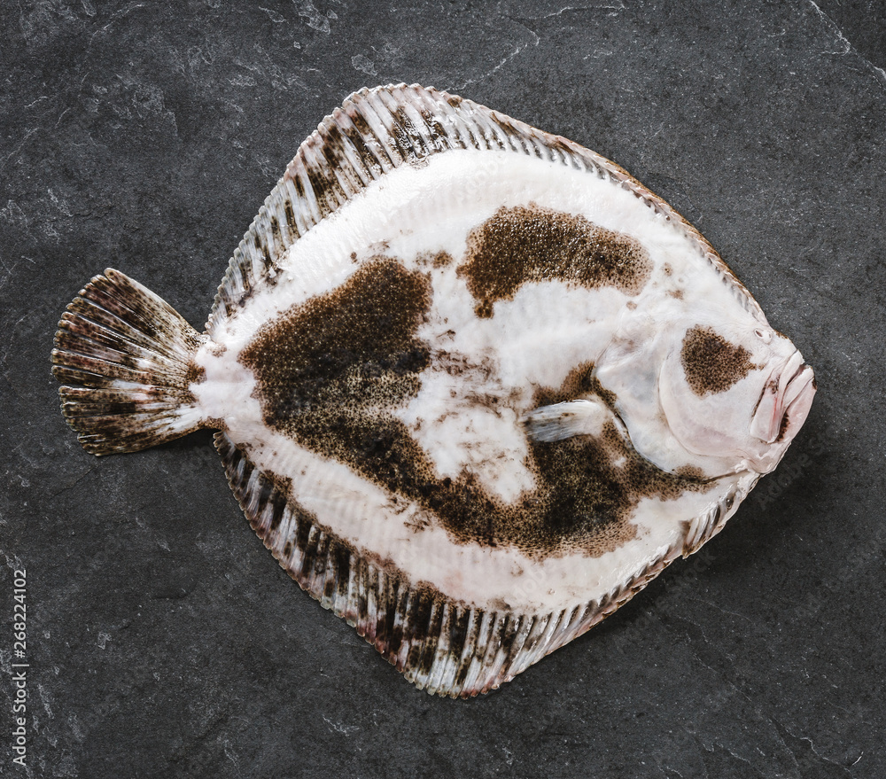 Raw whole flounder fish - back view, on dark stone background. Flat lay, top view.
