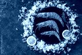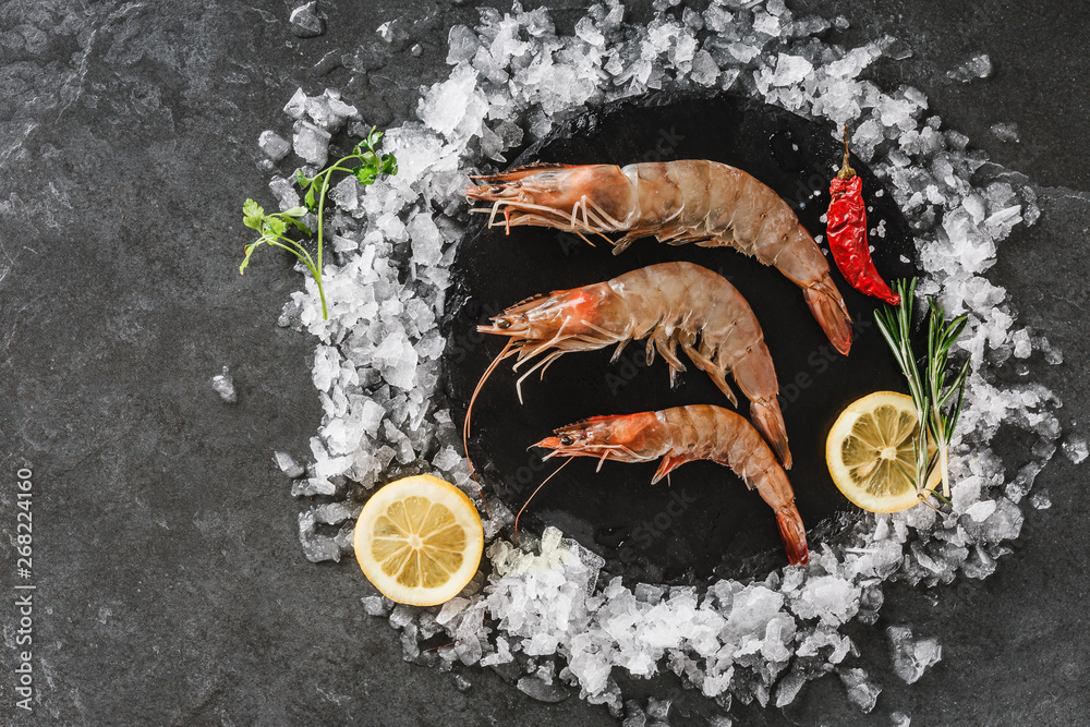 Fresh raw prawns or big shrimps with spices and ice on slate stone on dark stone background. Seafood, top view, flat lay, copy space.