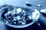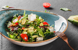 Healthy fresh salad with avocado, greens, arugula, spinach, cherry tomatoes and cheese in plate over dark table. Healthy vegan food, clean eating, dieting, top view
