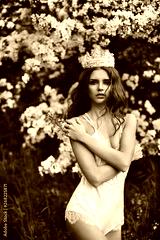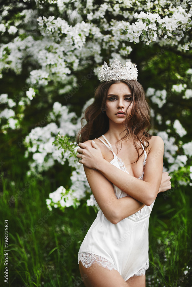 Beautiful and sexy young model woman with perfect body in stylish lingerie with the crown on her head posing under the blossoming tree at green forest