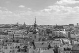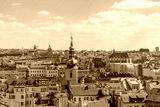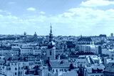 Aerial panoramic top view above old town and city skyline with famous attraction; Church of St. Gallen and Church of Our Lady of the Snows against blue sky on sunny day in Prague, Czech Republic.