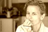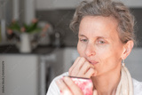 Close up of attractive middle aged woman with hand on chin looking at smart phone with kitchen in background - online dating concept (selective focus)