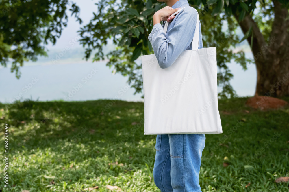 young woman holding cotton bag in green background
