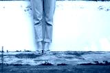 Yellow Sandals. Woman Wearing Flip Flops and Blue Jeans Standing on Old Cement Floor Background Great for Any Use.