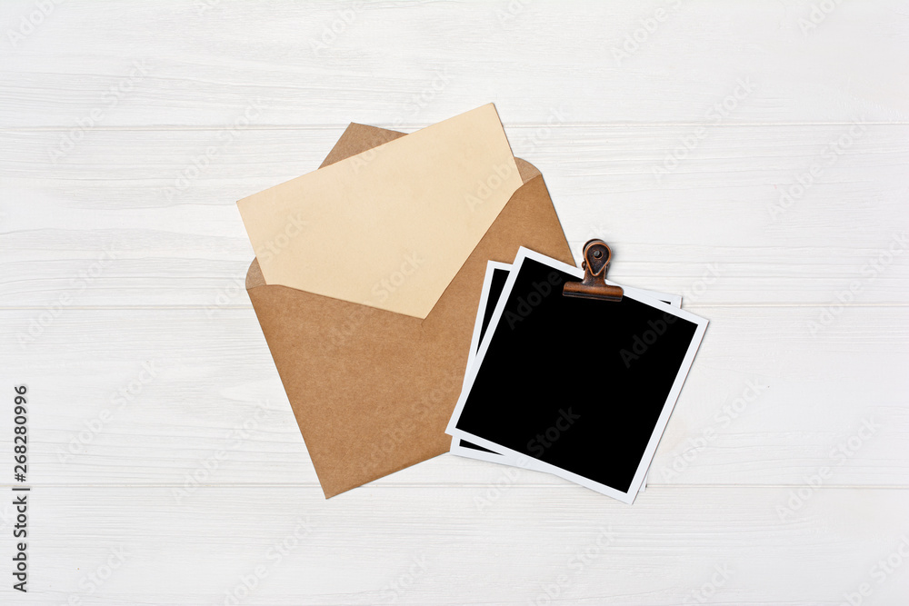 Blank old yellowed paper and mockup for vintage photo with envelope