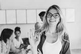 Close-up portrait of pretty female manager from sales department. Indoor photo of smiling girl working in office with discussing people on background.