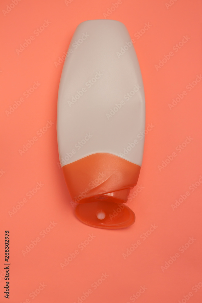 Beauty, decorative cosmetics bottles. Peach and purple colors background, flat lay, top view, minimalistic pop-art style