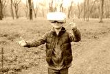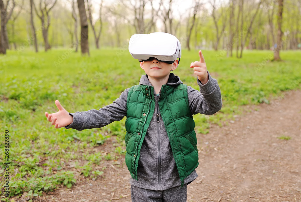 little child boy in glasses virtual reality on the background of greenery and forest.