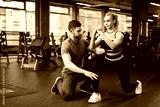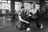 Sporty girl doing squats exercises with assistance of her personal trainer at public gym. Coaching assistance training concept