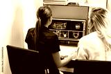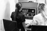 Female doctor shows the patient an x-ray image at display. Computer diagnostics dental tomography. Planning teeth treatment in modern dental clinic