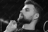 Getting perfect shape. Close-up side view of young bearded man getting beard haircut by hairdresser or barber at barbershop