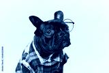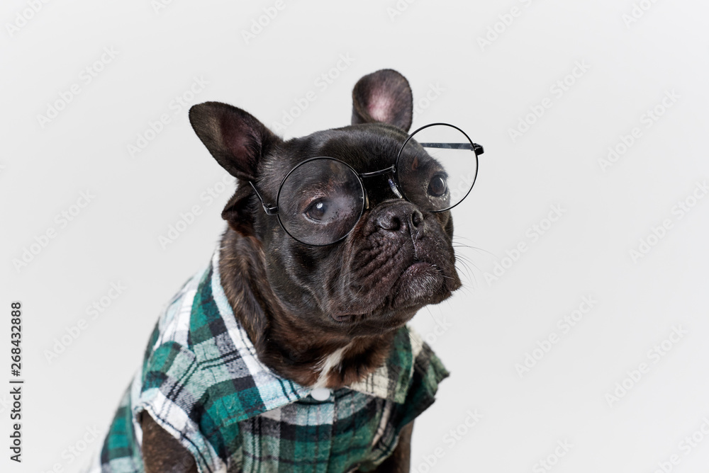 Smart dog. French bulldog in glasses and shirt, very smart and clever. Isolated on white background. Education concept