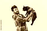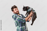 Hipster Bearded guy holding and hugging a nice French Bulldog dog in his arms with love and playing with him, against a white background