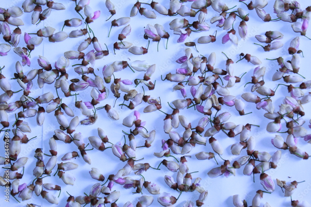 White purple and pink flowers of Millettia pinnata.floral pattern, white background