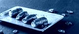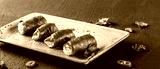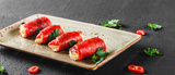 Rolls of baked pepper stuffed with cheese and sour cream on dark stone background. Vegetarian food, clean eating