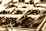 Grilled meat fillet canapes with baked pear and berry sauce in spoon on banquet table. Catering food, appetizer platter and snacks.