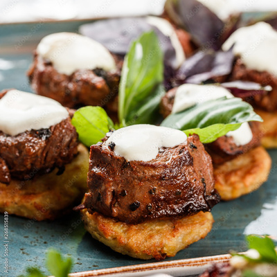 Meat fillet canapes with cream cheese and basil in plate on banquet table. Catering food, appetizer platter and snacks