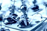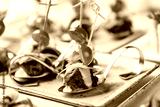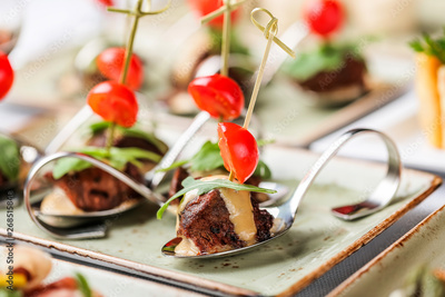 Grilled meat fillet canapes with cheese, tomatoes and greens in spoon on banquet table. Catering food, appetizer platter and snacks