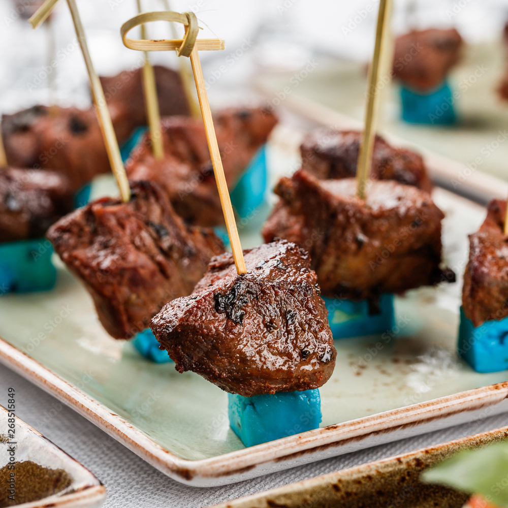 Meat fillet canapes with cheese tofu in plate on banquet table. Catering food, appetizer platter and snacks