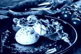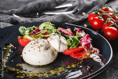 Poached eggs with fresh vegetable salad on grey plate background. Healthy vegetarian breakfast, clean eating, diet food, closeup.