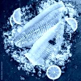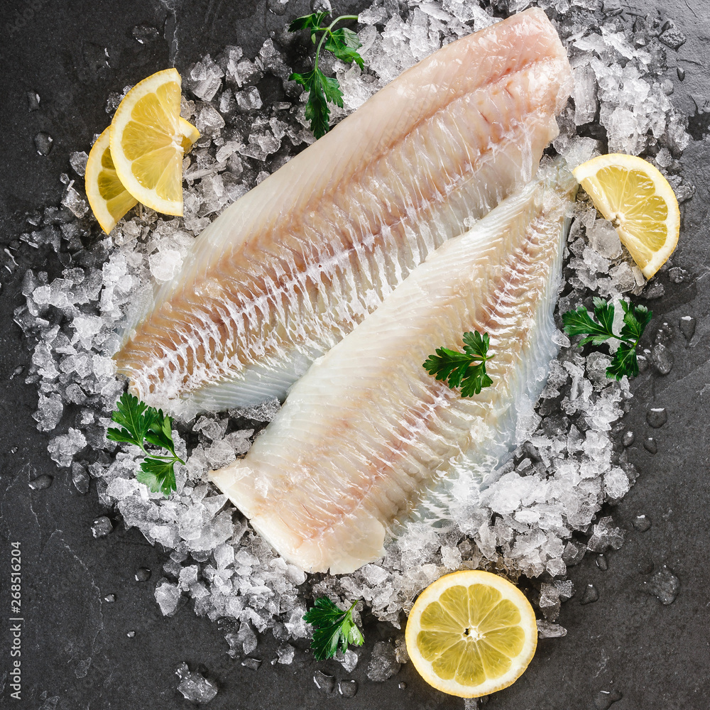 Fresh raw fillet white fish Pangasius with spices on ice over dark stone background. Seafood, top view, flat lay, copy space
