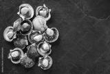 Raw scallops on slate stone background. Seafood, Shellfish, top view, flat lay, macro