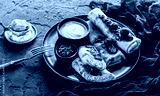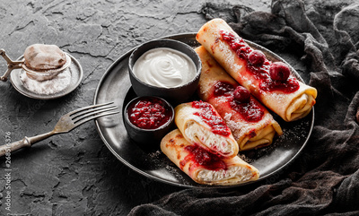 Crepes with cottage cheese, fruit jam, cherries, sour cream and icing sugar on black plate over dark background. Top view, flat lay. Pancake week or Shrovetide. Healthy breakfast. Top view