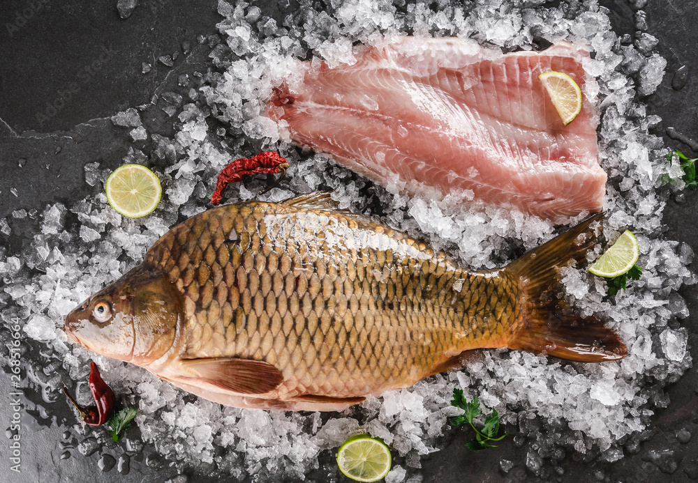 Fresh raw whole mirror carp and fish fillet with spices, lemon on ice over dark stone background. Creative layout made of fish, Seafood, top view, flat lay