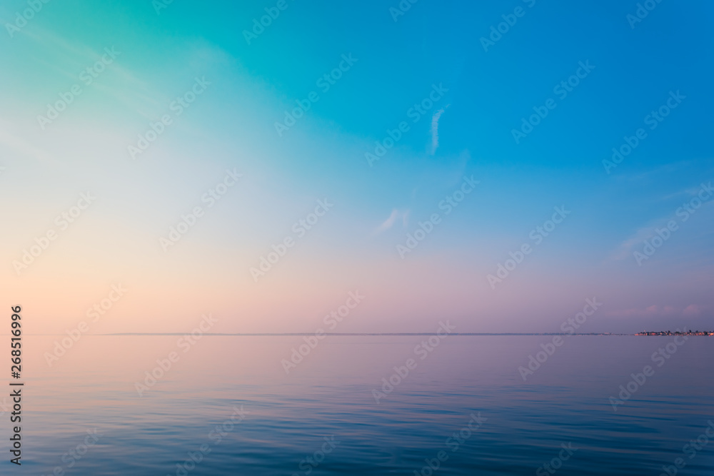 Horizontal sea line in the evening sunlight over sky background. Blue hour sunset. Summer adventure or vacation concept. Copy space.