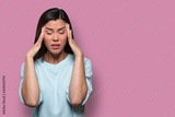 Woman overwhelmed with stress and concern, confusion and doubt, hands to head, on pink background copy space