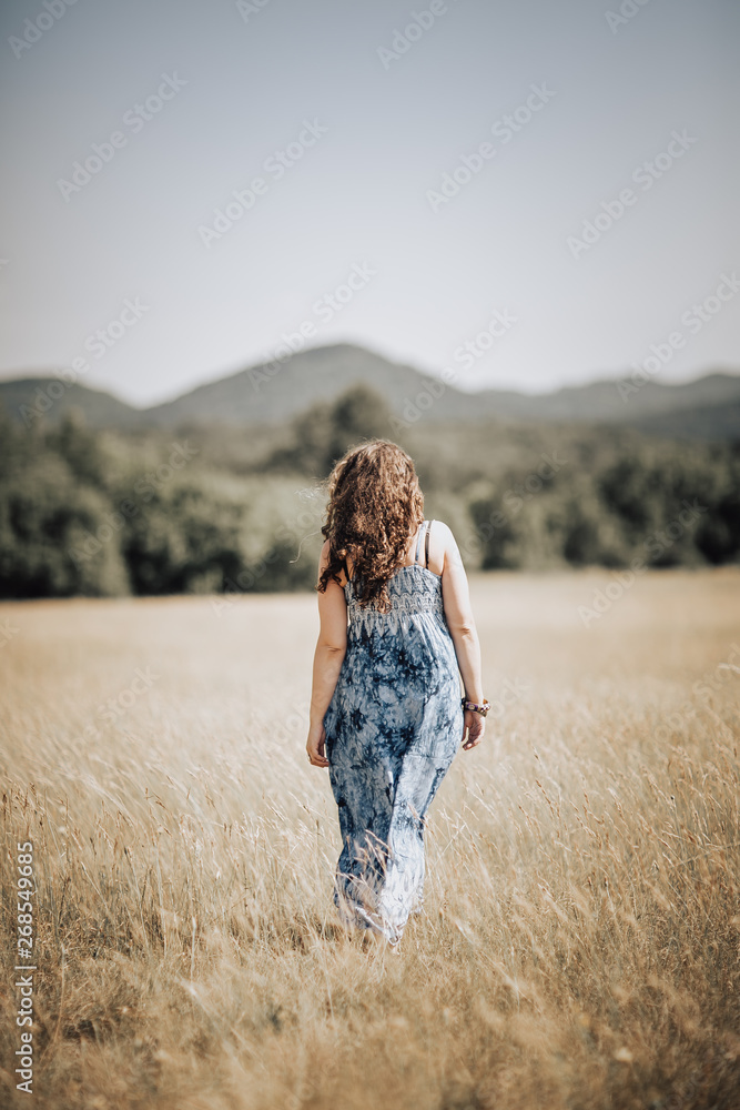 Beautiful young caucasian woman walking on the summer grass meadow. Concept woman liberty