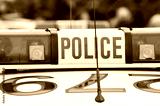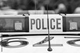 Blue lights on top of a police car in an emergency situation event