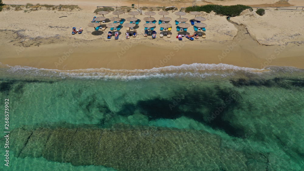 Aerial drone top view photo of breathtaking turquoise sandy beach of Plaka with sun beds and umbrellas, Naxos island, Cyclades, Greece