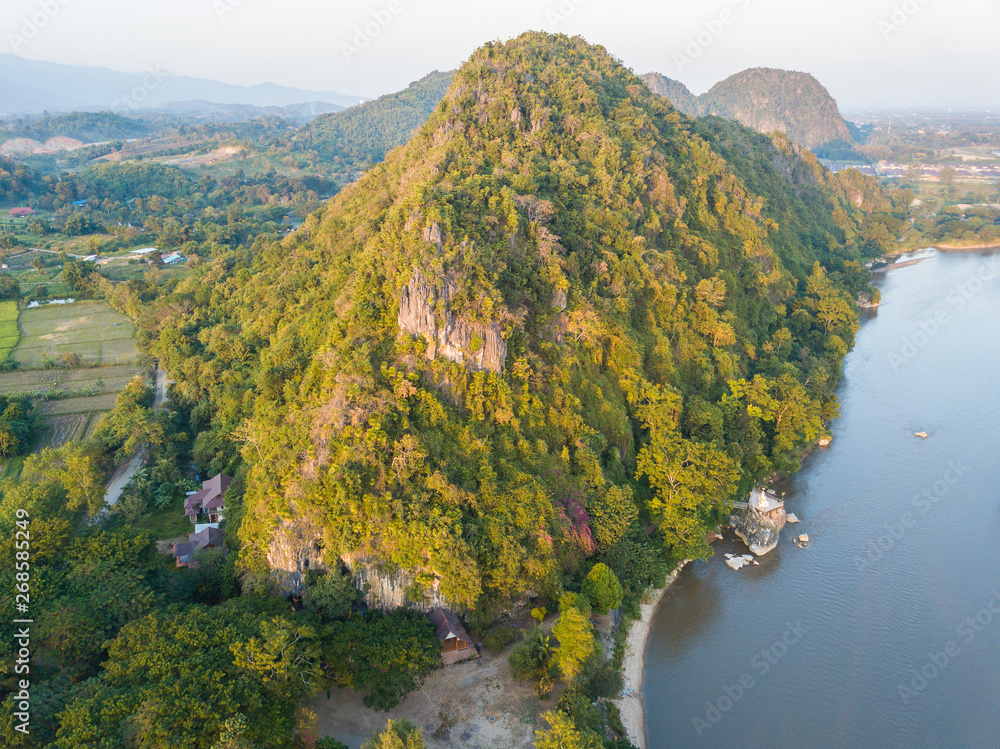 The high angle view of mountains and Kok river nearly Chiang Rai beach a river bank with rocky shores view. It’s a popular spot for locals and tourist for enjoy the view of tranquil river.
