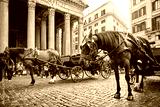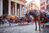 Rome, Italy. Horse in harness with coach for entertaining touristic strolls and city tours at Rotunda square (Piazza della Rotonda) in front of Pantheon ancient roman building with columns.
