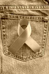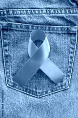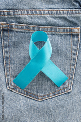 Blue ribbon symbolic of prostate cancer awareness and men's health in November month on Jeans denim