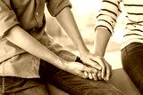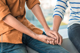 Psychologist sitting and touch young depressed asian woman for encouragement near window with low light environment, Selective focus, PTSD Mental health concept,