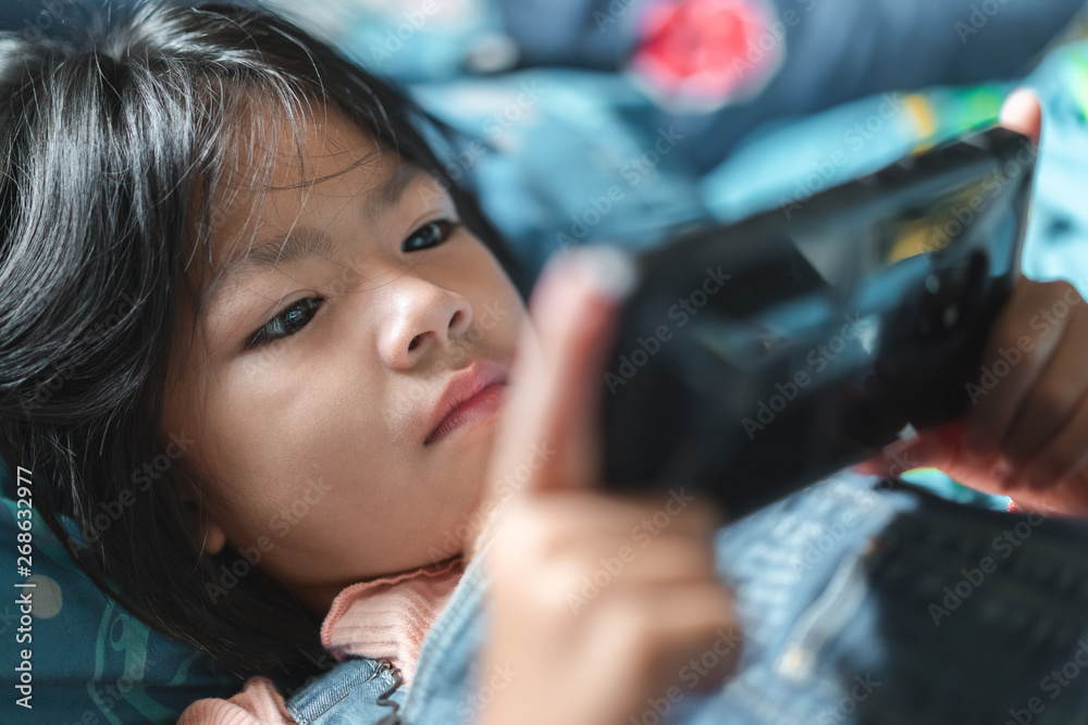 Little cute girl playing games on her smathphone on morning time after wake up, Selective focus, Children’s Smartphone Addiction problem.