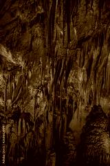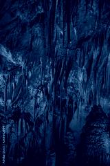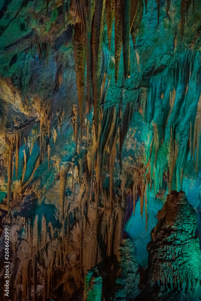 illuminated stalagtites in Prometheus Cave