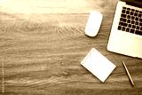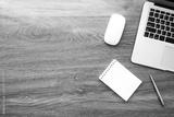 Wood office desk table with laptop computer, blank notebook page and supplies. Top view with copy space, flat lay.