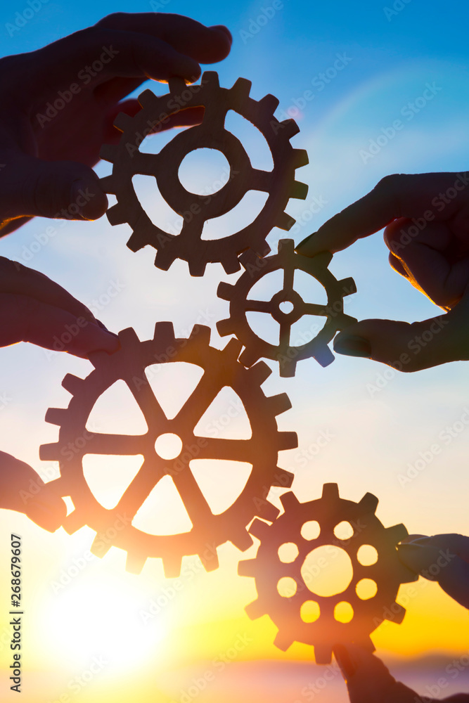 Gears in the hands of people on the background of the evening sky. the mechanism of teamwork. interaction.