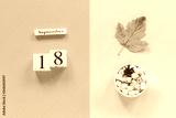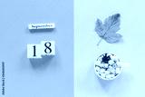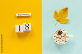 Autumn composition. Wooden calendar September 18, cup of cocoa with marshmallows and yellow autumn leaves on yellow blue background. Top view Flat lay Mockup Concept Hello September