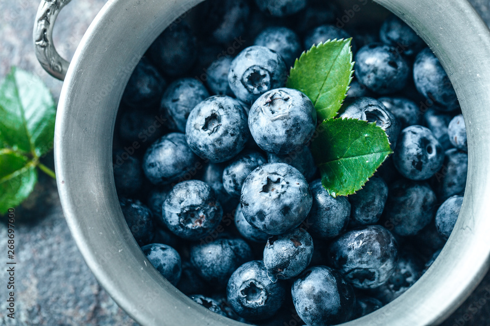 Freshly picked blueberries in bowl on old metal background. Healthy eating and nutrition.